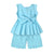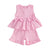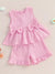 - DESIGN FEATURES: Sleeveless top with decorative bow details and gathered waist, paired with matching ruffled shorts for a charming look