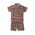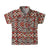 This 2-piece featuring a short-sleeve button-up shirt with a chest pocket and coordinating elastic-waist shorts, this outfit showcases a striking all-over tribal-inspired geometric pattern in vibrant shades of black, white, red, and orange. Crafted from lightweight, breathable fabric, it's perfect for warm-weather outings or casual gatherings. Stylish, comfortable, and easy to wear.