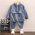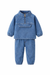 Two-piece denim outfit featuring a half-zip sweatshirt with front pocket patch and matching jogger pants with 2 side pockets and elasticated waistband.