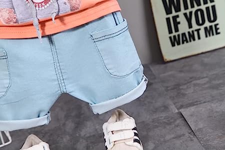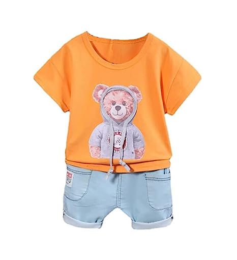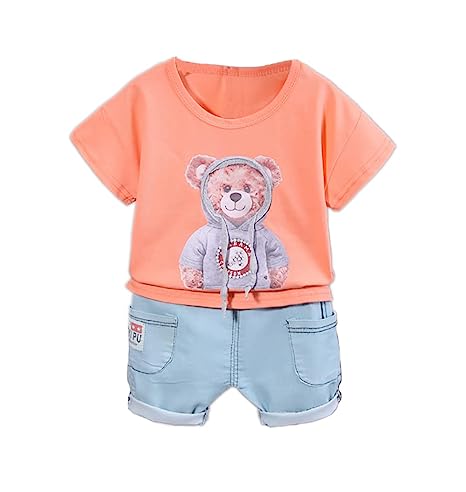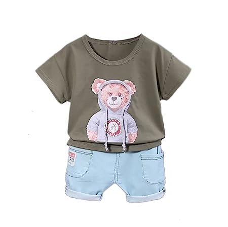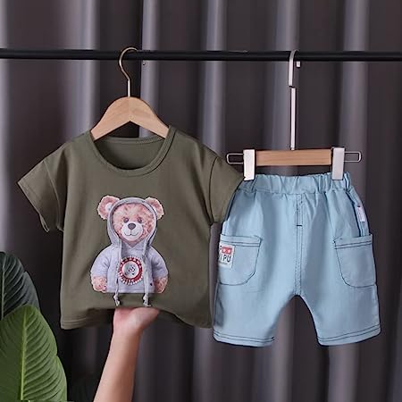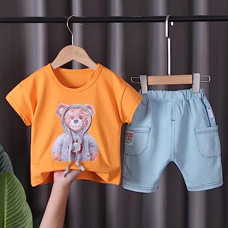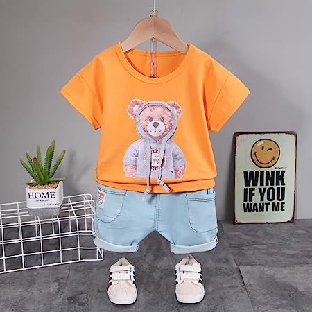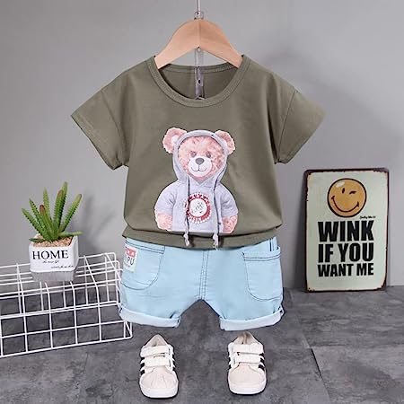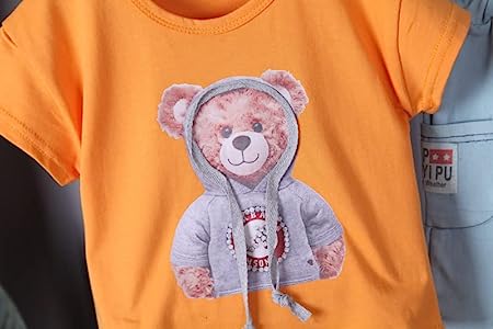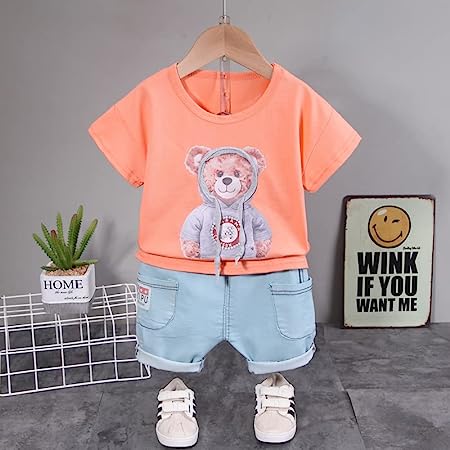 Cute Teddy Bear in Hood 3D Cartoon Print Half Sleeve T-shirt with Shorts Knicker for Infant Toddler Kids