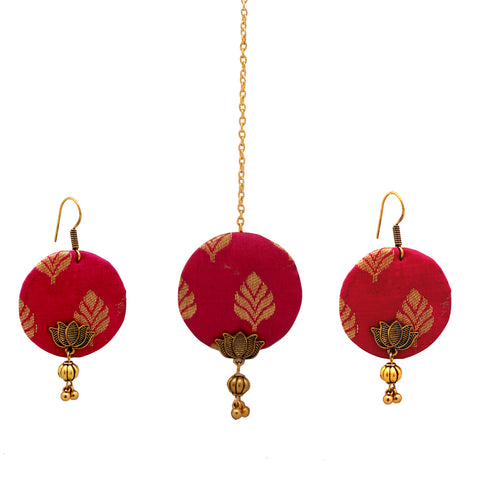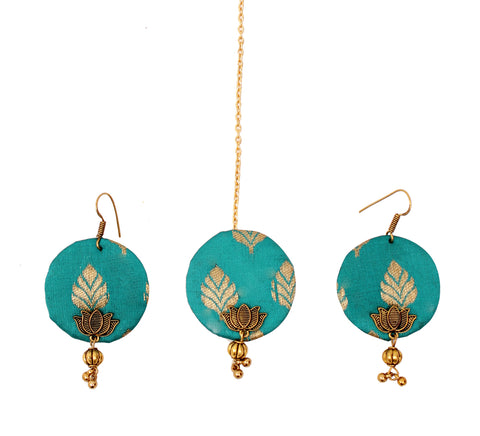 Ethnic Silk Fabric Designer Contemporary Lotus Bead Borla Maang Tika with Oxidized Dangle Earrings Wedding Party Jewelry Set