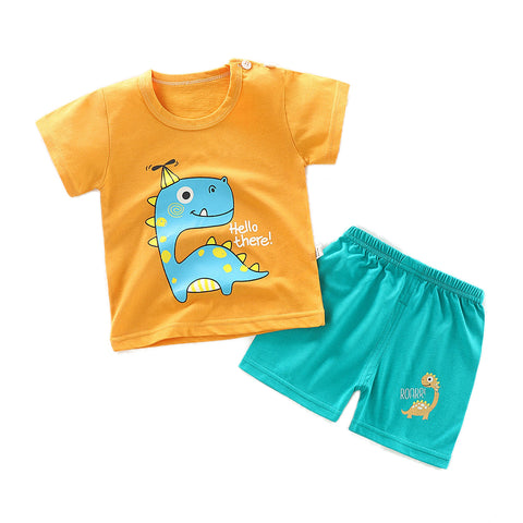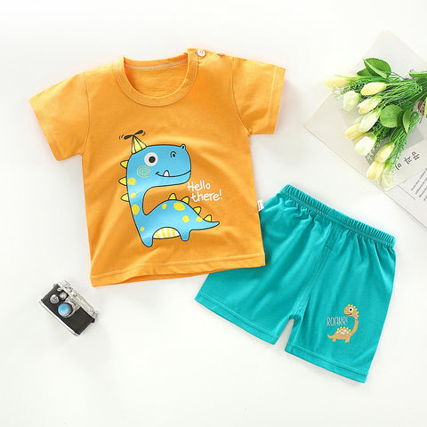 Half Sleeve Dinosaur Fun Cartoon Print Cool T-shirt and Shorts Summer Clothing Set for Infant Toddler Kids